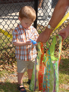Austin, on the other hand, wasn't so sure why he had to pick up the mess of eggs just laying on the ground at the playground. He quickly caught on after Uncle Mark showed him that there was candy in all the eggs...